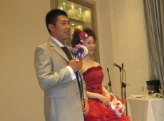 乾杯を熱唱する阪本キャップ(右) 新郎よりお礼の挨拶